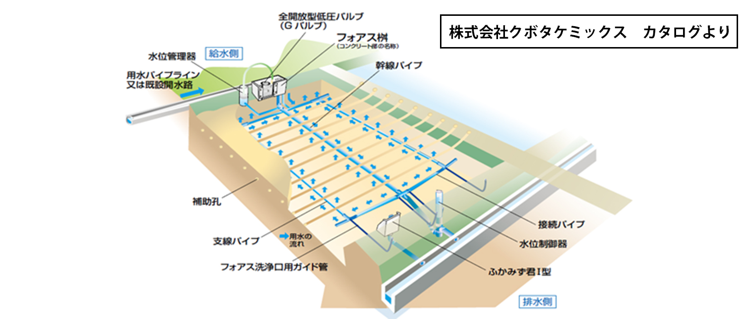 真野地区では、ほ場の大区画化や全面パイプライン化に加え、地下水位制御システム「フォアス」を導入しました。フォアスは、地下水位を調整し、作物に適した水分環境を維持することで、田畑輪換が容易となる仕組みです。
